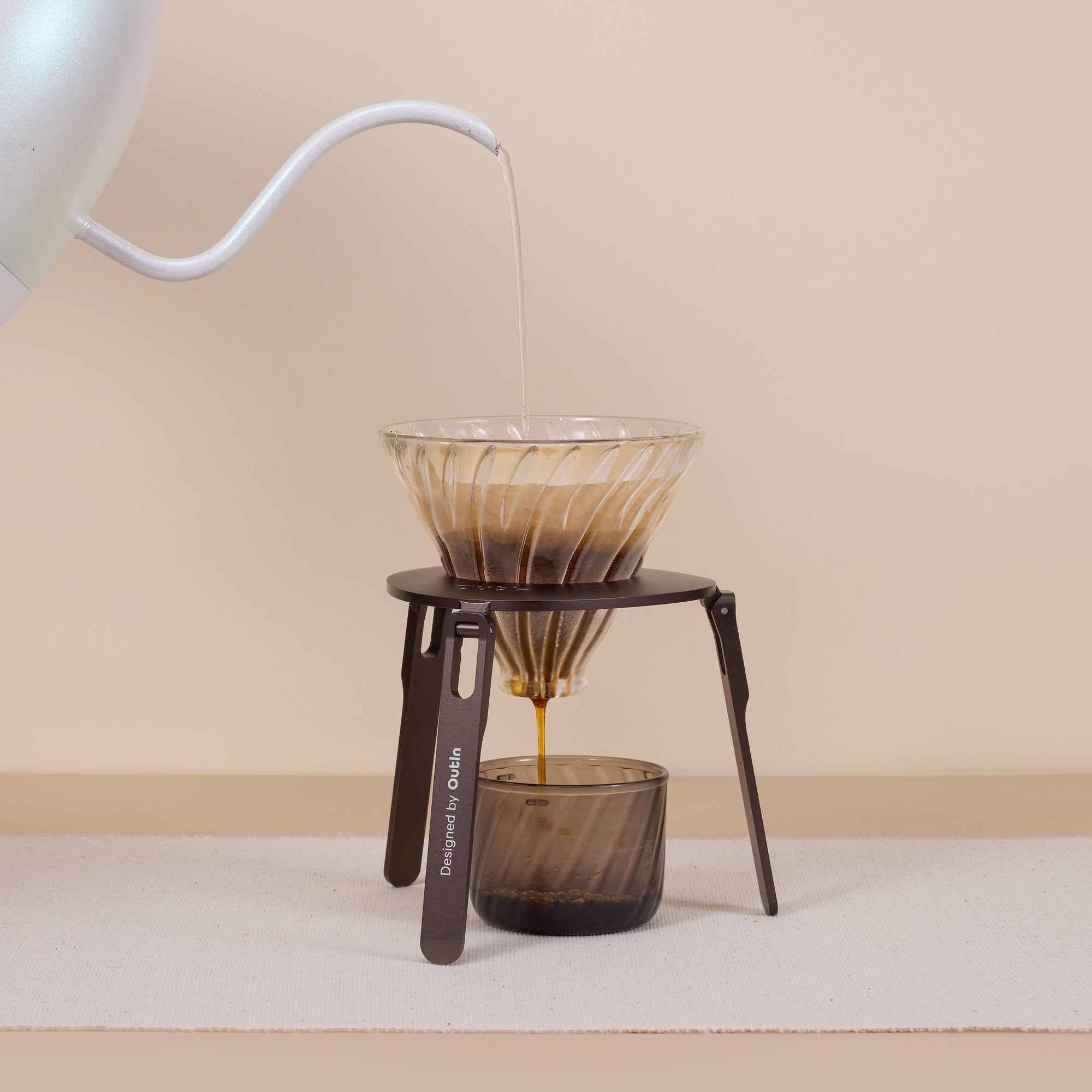 The stand elevates your coffee ritual, letting your OutIn Mino or Nano sit securely while you enjoy a smooth, hands-free pour.